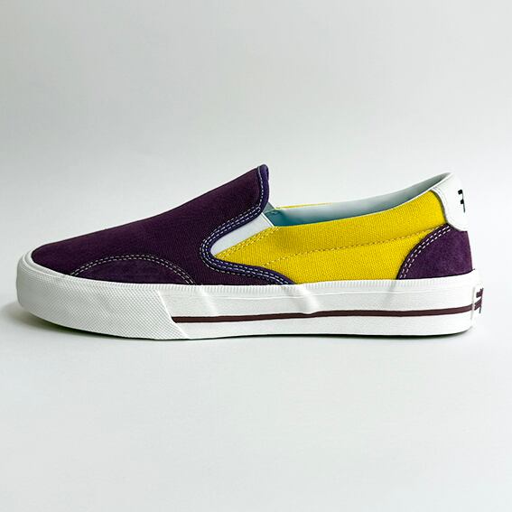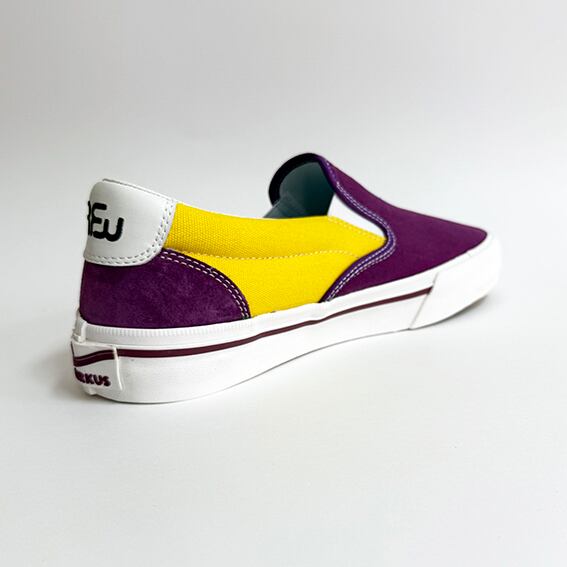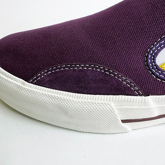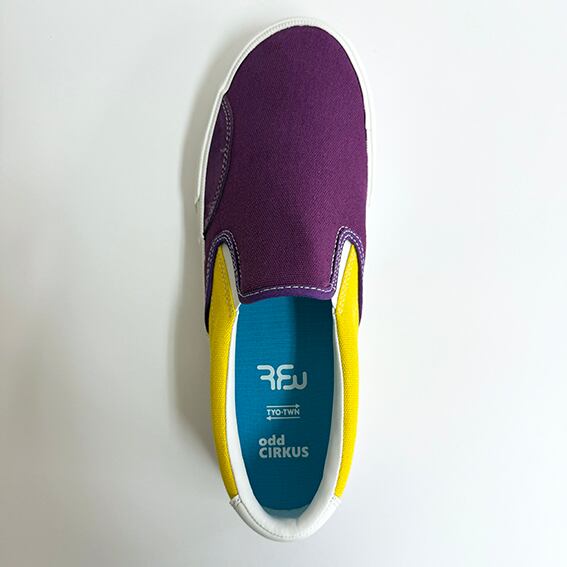 2026SSの新作『SEESAW CVS』は、パープルとイエローのツートンカラーが目を引くキャンバススリッポンです。軽やかな履き心地と遊び心満載のデザインが特徴で、気軽にスタイルに取り入れやすいアイテムとなっています。クッション性の高いソールが、足裏を優しくサポートし、長時間の使用でも快適さを保つことができます。アウトソールもリサイクルラバーを使用してます。